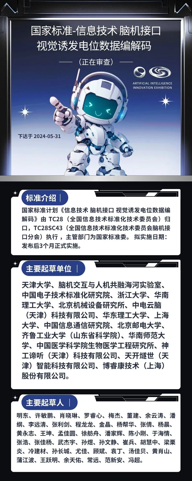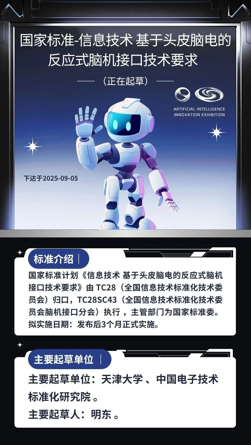 脑机接口作为前沿技术,正处于快速发展阶段。其融合了神经科学、工程学、计算机科学等多学科领域知识,旨在实现大脑与外部设备之间的直接信息交互,可广泛应用于医疗康复、工业安全、教育娱乐等多个领域。脑机接口既是修复生命功能的“医学桥梁”,也是突破人机交互边界的“科技革命”。而国家及行业标准则是其规范发展、保障安全的关键支撑。本文就来盘点当前脑机接口领域的现行、正在审查和正在起草的国家及行业相关标准,带你快速理清技术落地的“规则手册。”